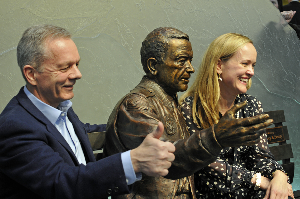 Sen. Stevens’ son, Ben, and daughter, Lily Stevens Becker, pose with the sculpture of their father after the unveiling and dedication. Fran Durner / Stevens Foundation photo